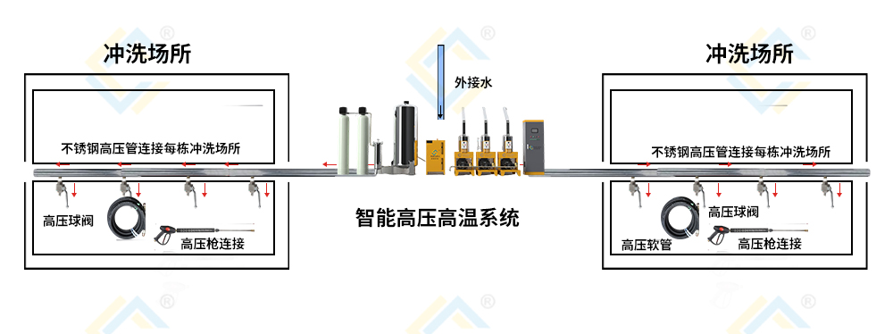 通過場(chǎng)所平面圖,選中合適位置布局智能高壓高溫主機(jī),外接水通過主機(jī),向各個(gè)場(chǎng)所供應(yīng)高壓高溫水,并且可以實(shí)現(xiàn)物聯(lián)網(wǎng)控制主機(jī)啟動(dòng),員工只需攜帶高壓軟管和高壓水槍就可以作業(yè),各個(gè)場(chǎng)所可以同時(shí)作業(yè),提高工作效率,無觸電風(fēng)險(xiǎn)!