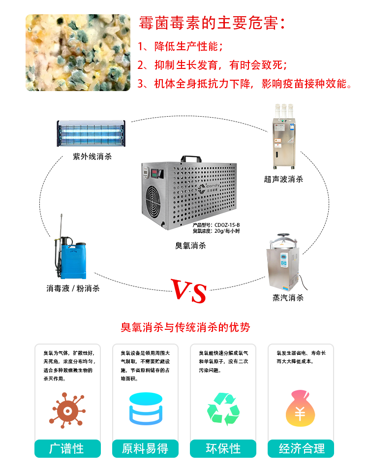 3、 防霉保鮮:臭氧對霉菌具有極強(qiáng)的殺滅和抑制能力,同時(shí)可吸收果蔬呼吸排出的乙烯氣體,抑制貯藏中的果蔬繼續(xù)成熟,對于食品、果蔬有極好的防霉、保鮮作用。