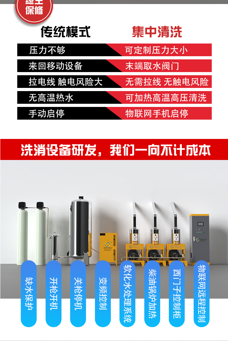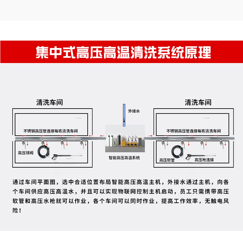 通過場所平面圖,選中合適位置布局智能高壓高溫主機(jī),外接水通過主機(jī),向各個場所供應(yīng)高壓高溫水,并且可以實現(xiàn)物聯(lián)網(wǎng)控制主機(jī)啟動,員工只需攜帶高壓軟管和高壓水槍就可以作業(yè),各個場所可以同時作業(yè),提高工作效率,無觸電風(fēng)險!